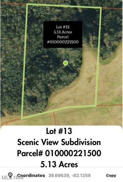 Building Lot available in Crooksville! 5.13 acres of land located in the Scenic View Subdivision. This lot is level in the front with rolling hills, rock caves, a pond & riding trails. There is no zoning in this subdivision. Gas & Electric & City water already available. Connecting Lot #14 1405 State Route 13 SE with 5.86 acres is also available for purchase and the lots are listed together on the MLS as well. MLS #5178850